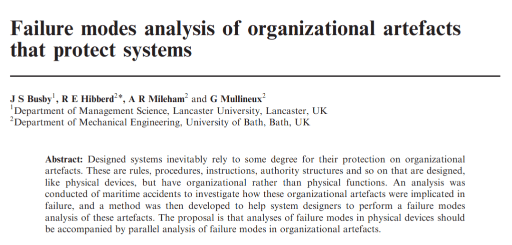 · “It seems clear from the analysis of historical failures, that organizational elements, and organizational artefacts in particular, contribute to risk and yet are almost universally relied on to some extent to protect designed systems from failure. This means that any technical risk analysis needs to be accompanied by an organizational [artefact] risk analysis”