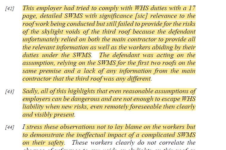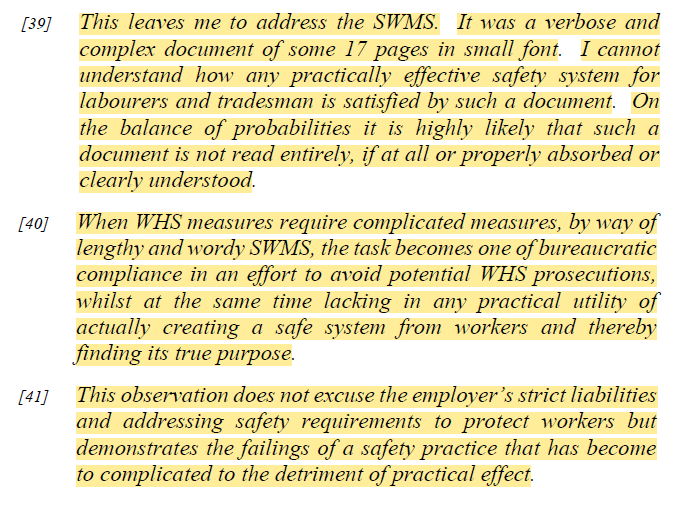 - Regarding the SWMS: “It was a verbose and complex document of some 17 pages in small font. I cannot understand how any practically effective safety system for labourers and tradesman is satisfied by such a document”