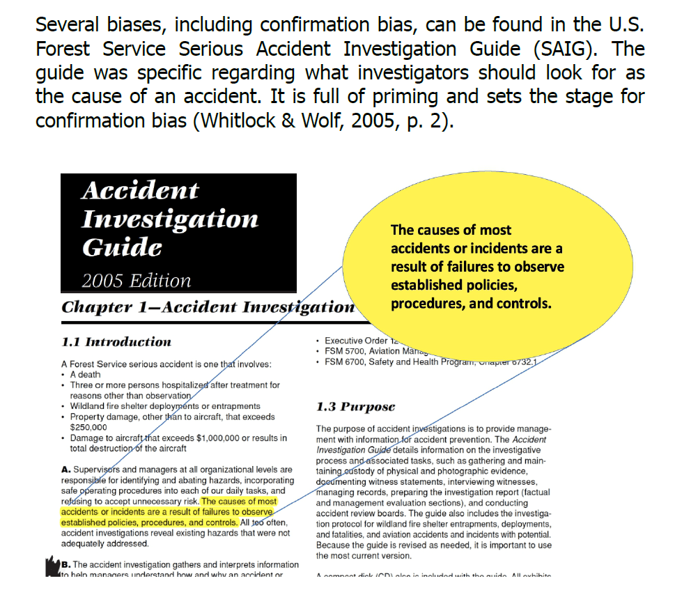 · The investigation guide “was specific regarding what investigators should look for as the cause of an accident. It is full of priming and sets the stage for confirmation bias”