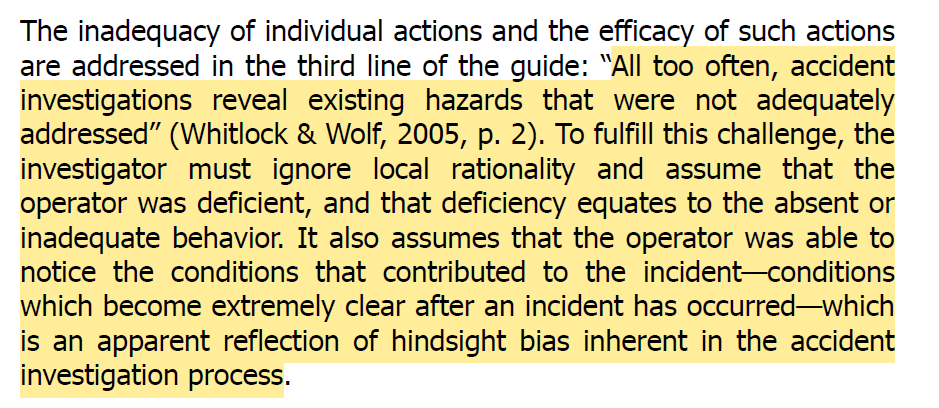 · They point to how the guide primes the investigator to “ignore local rationality and assume that the operator was deficient, and that deficiency equates to the absent or inadequate behavior”