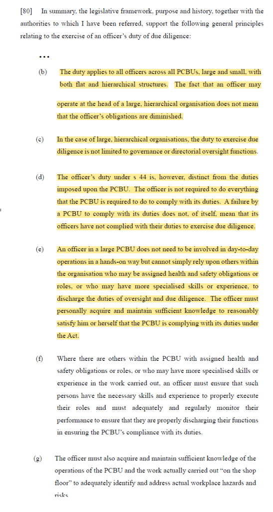 c) In large hierarchical organisations, the duty “is not limited to governance or directorial oversight functions”, and an officer does not “need to be involved in day-to-day operations in a hands-on way but cannot simply rely upon others within the organisation who may be assigned health and safety obligations”