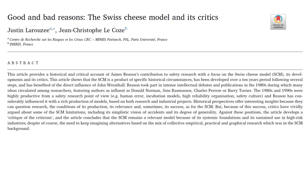 · “The natural conclusion of these established safety researchers is that “the Reason’s Swiss cheese is no longer adapted to anticipate today’s accidents”