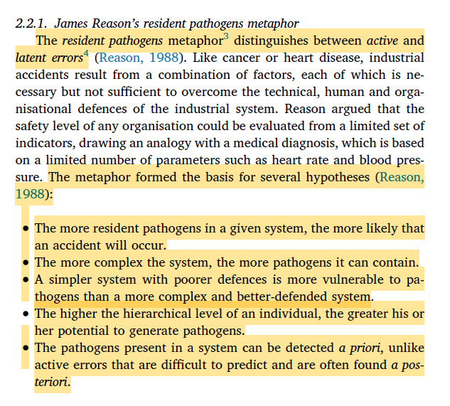 · “the principal contribution of his metaphor is not to demonstrate the existence of latent conditions, but to suggest that they must be detected and addressed a priori. It is important to note that this proposition is not equivalent to determinist, accident proneness theory”