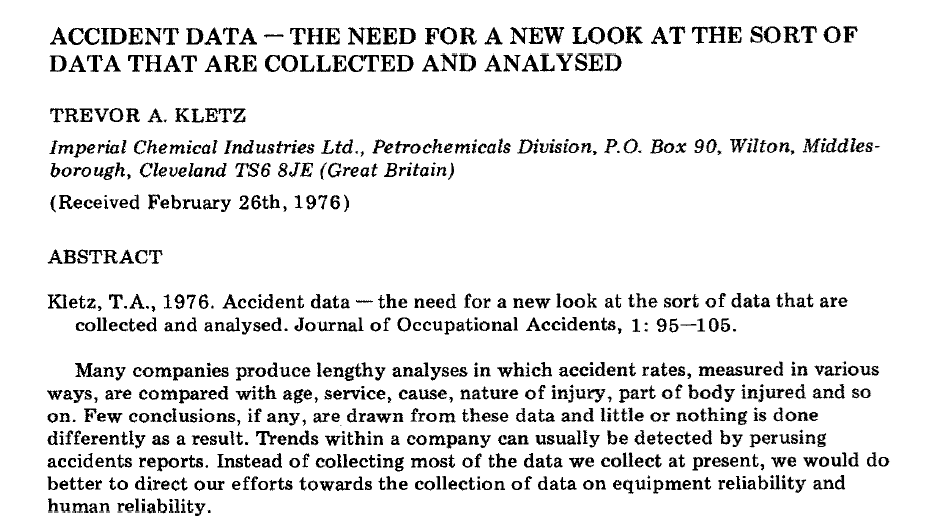 · Even by 1976, Kletz was critical of conventional safety indicators – “I have in front of me the annual accident analysis prepared by one division of a large chemical company. There are twelve pages of tables in which accidents, measured in various ways, are tabulated”