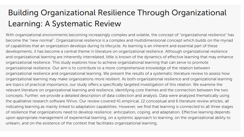 Ref: Evenseth, L. L., Sydnes, M., & Gausdal, A. H. (2022). Building organizational resilience through organizational learning: A systematic review. Frontiers in Communication, 7, 837386.