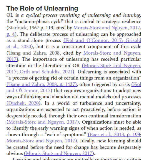 OL involves a cyclical process of unlearning and learning. It’s associated with getting rid of certain things from an organisation, and is often triggered by crisis. It requires “organizations to adopt new ways of thinking and abandon old mental models and processes”.