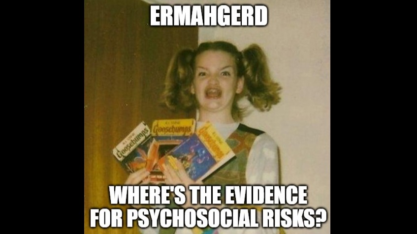 “wHeRe iS tHe eViDeNcE fOr pSyChOsOcIaL risks?!1?!11” I can’t be bothered repeatedly linking to the dozens of systematic reviews and meta-analyses on the connections between psychosocial factors and various indices of health, safety, and organizational performance on LinkedIn. So, I’m just compiling a few into a mini-collection. WAY WAY WAY too much to systematically cover … Continue reading Mini-Comp: Psychosocial Risks / Mental-Ill Health / Psychological Injury