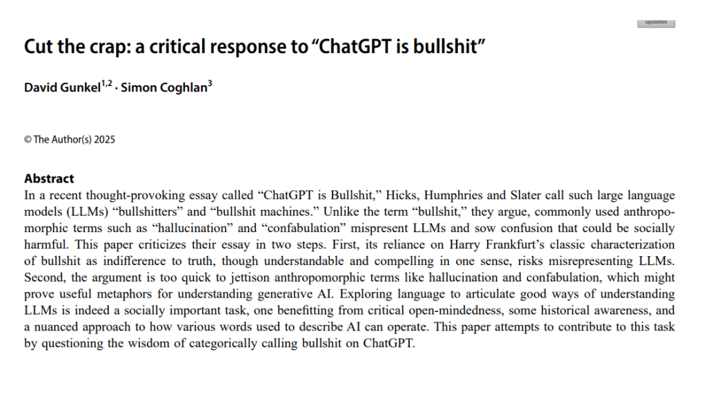 Ref: Gunkel, D., & Coghlan, S. (2025). Cut the crap: a critical response to “ChatGPT is bullshit”. Ethics and Information Technology, 27(2), 23.