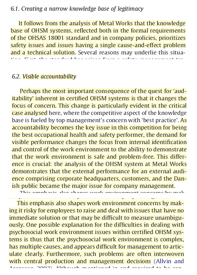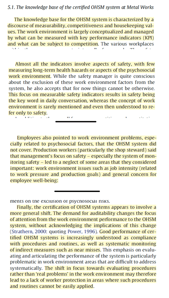 · “Good performance of certified OHSM systems is increasingly understood as compliance with procedures and routines”