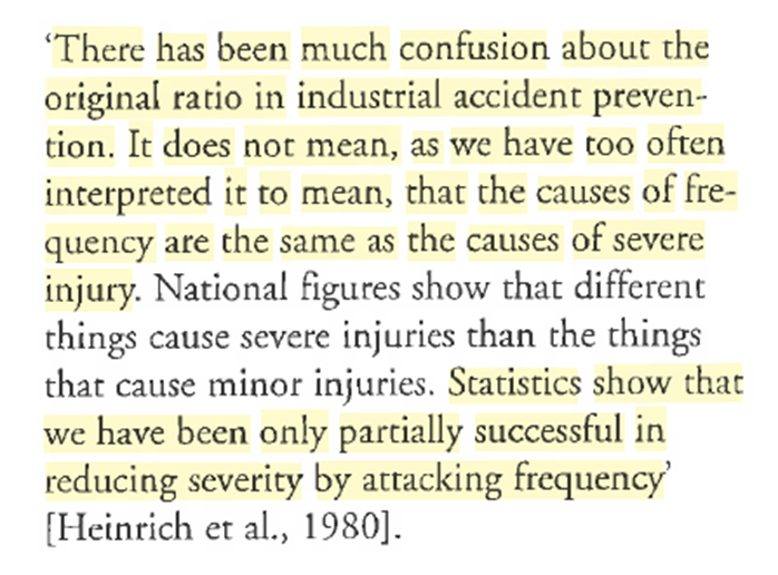 I’ve skipped a lot of the reasoning and argumentation around the jank interpretation of Heinrich’s work. But one conclusion for Hale is the “strength of the belief in identical causes of major and minor accidents which, subsequent to Heinrichs original work, grew up among safety practitioners, and apparently also among researchers”.