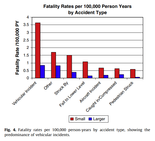Ref: Holizki, T., McDonald, R., & Gagnon, F. (2015). Patterns of underlying causes of work-related traumatic fatalities–Comparison between small and larger companies in British Columbia. Safety science, 71, 197-204.