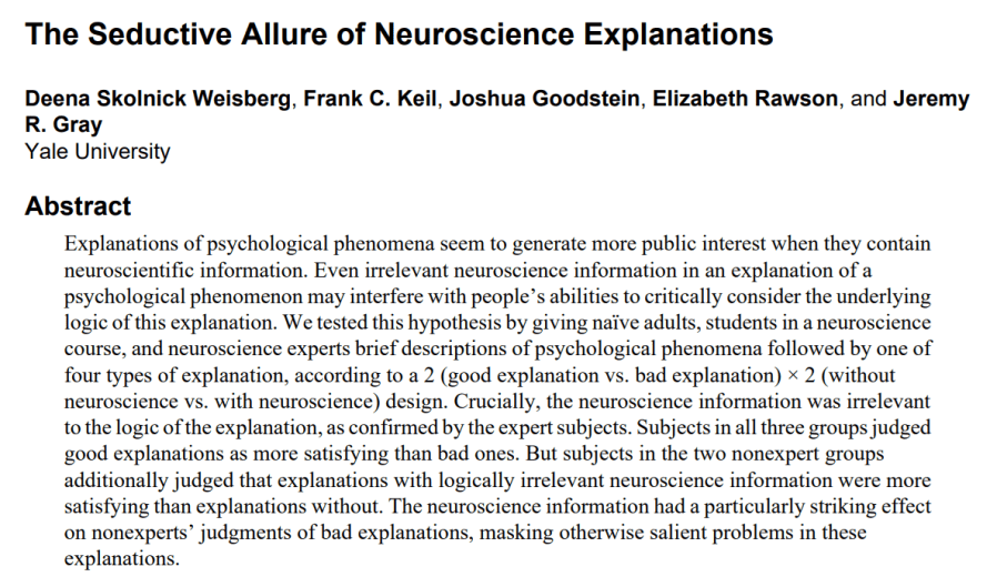 More interestingly, the subjects in the two nonexpert groups judged the explanations with “logically irrelevant neuroscience information [as] more satisfying than explanations without” (p470). Furthermore, as quoted in the paper the “neuroscience information had a particularly striking effect on nonexperts’ judgments of bad explanations, masking otherwise salient problems in these explanation” (p470).