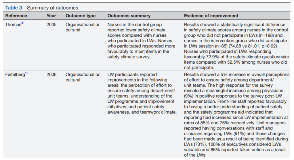 Interestingly, some research (not all covered in this review) found worsening measures after LWs, like with trust or safety climate scores.