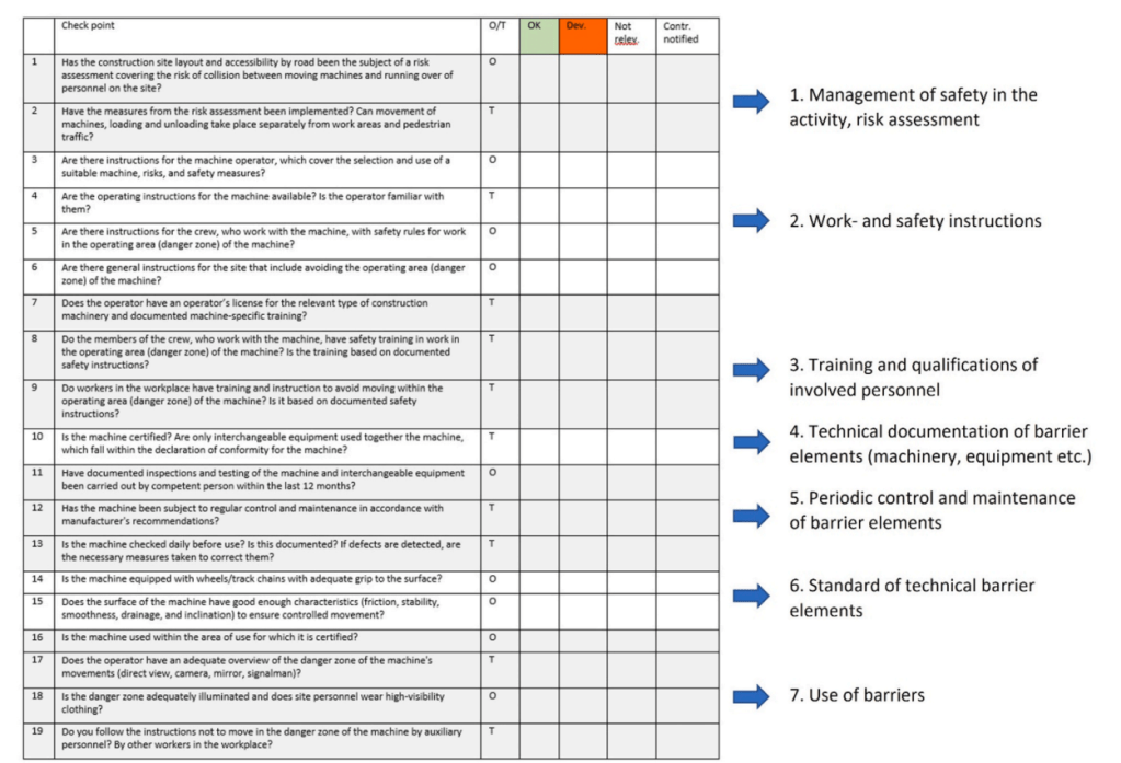· Per the checklist – topic 1 targets indirect checks of whether adequate measures have been taken in the planning and risk assessment of construction work, topics 2 and 3 cover measures of qualifications and skills, topics 4 and 5 address measures at ensuring adequate standard of machinery and equipment, and topic 7 captures observable human performance