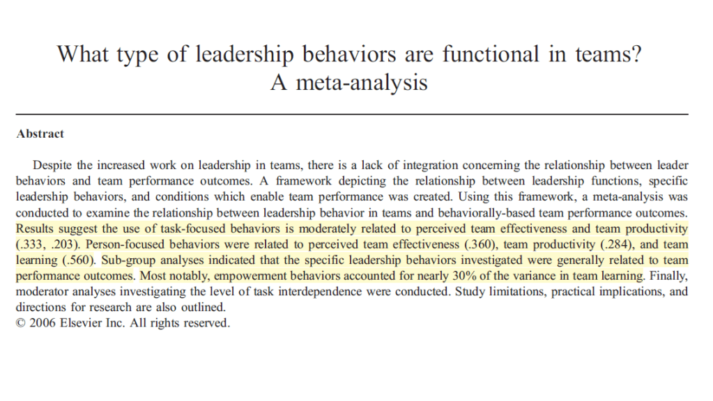 • Empowerment behaviors were particularly impactful, accounting for “nearly 30% of the variance in team learning” (r=.560). They also significantly related to perceived team effectiveness (r=.465) and team productivity (r=.315) and these behaviors include “coaching, monitoring, and feedback”