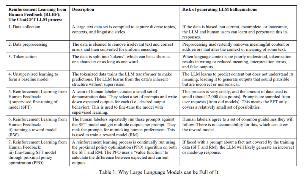 LLMs hallucinate when they generate “seemingly realistic responses that are untrue, nonsensical, or unfaithful to the provided source input”. LLMs aren’t lying, since they have no intrinsic motive to deceive, nor know the meaning of their responses.