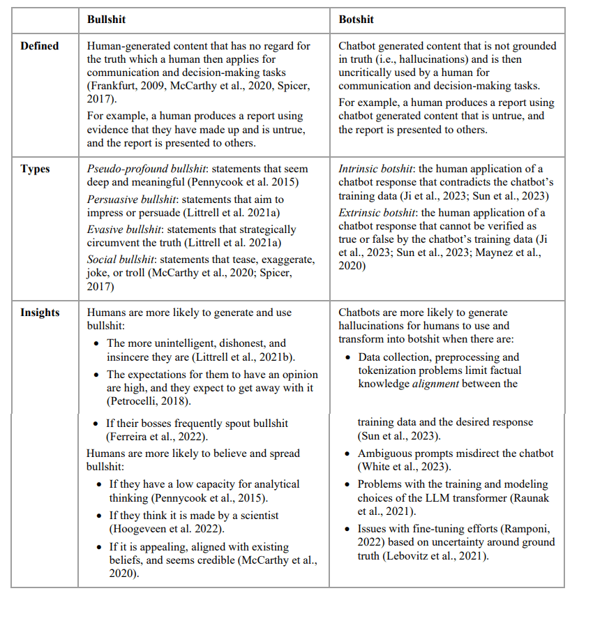 Tl;dr: generative chatbots predict responses rather than knowing the meaning of their responses, and hence, “produce coherent-sounding but inaccurate or fabricated content, referred to as hallucinations”. When used uncriticually by people, this untruthful content becomes botshit.