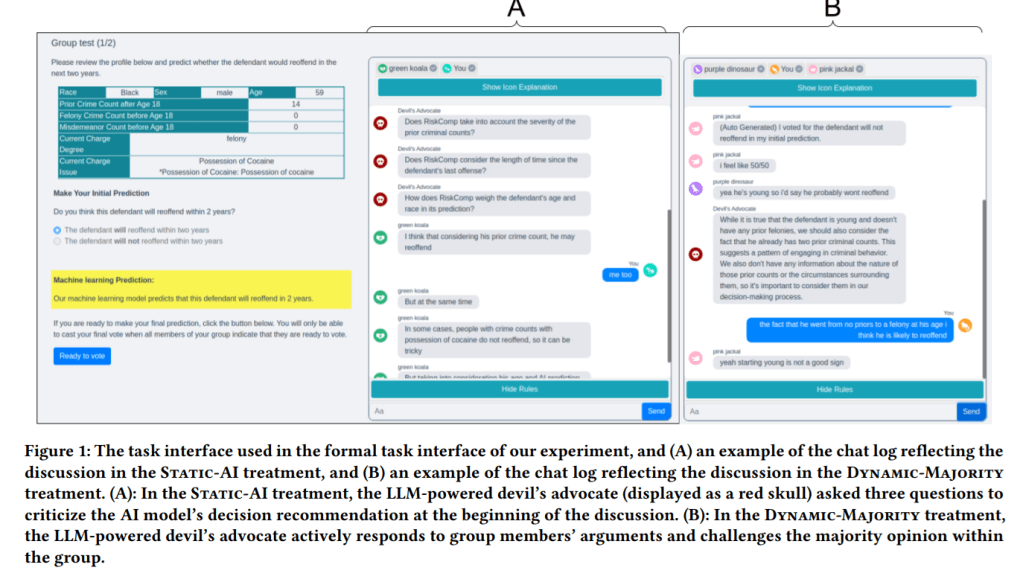 For methods, they had human groups assess recidivism risk with the assistance from intentionally biased AI models. An LLM devil’s advocate was also introduced with varying target of objection