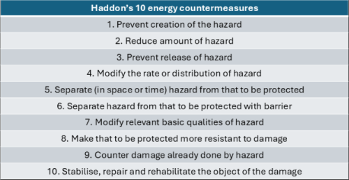 3. In this quickisode, Haddon’s 10 countermeasures for energy exchanges was discussed. Haddon’s approach can be considered as an alternative or compliment to the Hierarchy of Controls.