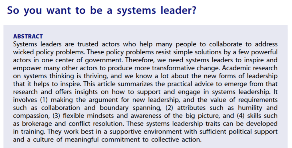 · Systems leaders are “trusted actors who help many people to collaborate to address wicked policy problems”