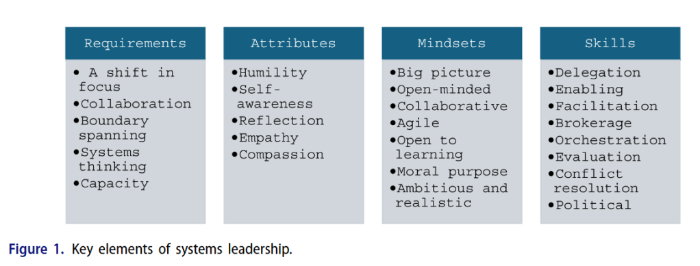· Systems leadership involves: “(1) making the argument for new leadership, and the value of requirements such as collaboration and boundary spanning, (2) attributes such as humility and compassion, (3) flexible mindsets and awareness of the big picture, and (4) skills such as brokerage and conflict resolution”