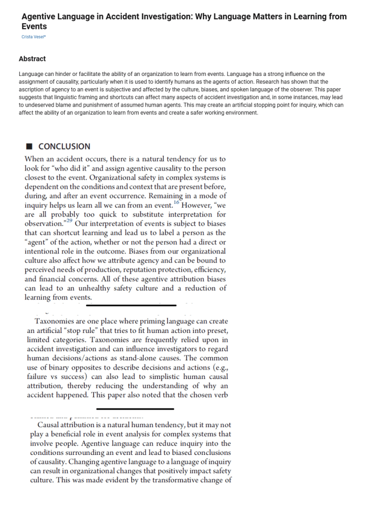 Image 1: Vesel, C. (2020). Agentive language in accident investigation: Why language matters in learning from events. ACS Chemical Health & Safety, 27(1), 34-39.