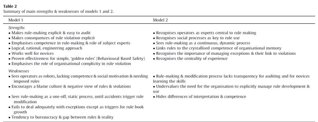 Model 2: focuses on rules as tools that people use for support but relying more on their experience – accepting that rules can’t cover all contingencies & people need to adapt to successfully & safely complete work.