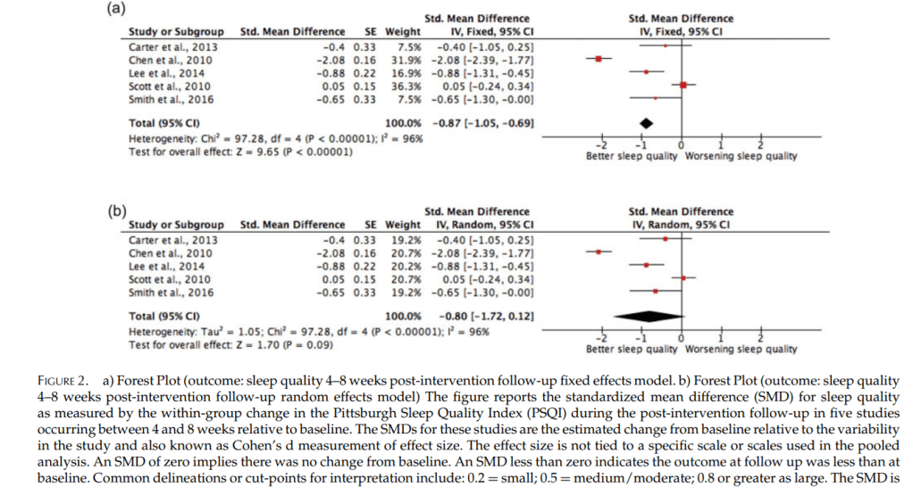 ·        For sleep quality, analysis of 5 studies “showed improvement in sleep quality”, with the effects of fatigue education and training on sleep quality being “large and statistically significant”  at 4-8 wks post-baseline, interpreted as favourable