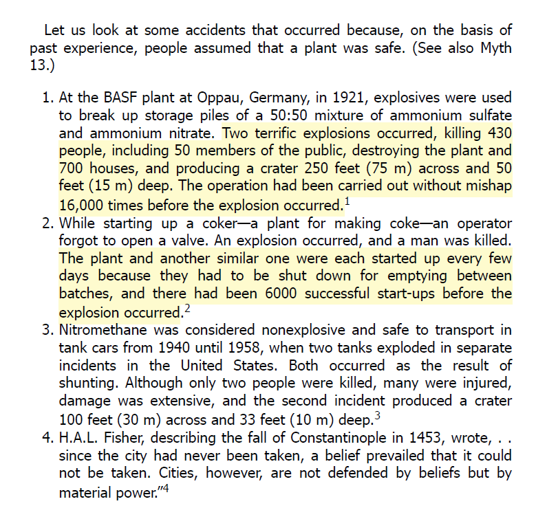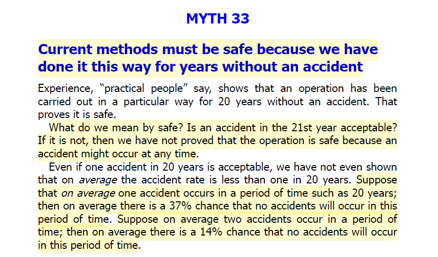 Here Kletz challenges the statement “We’ve done it this way for 20 years without an accident, so it must be safe”.