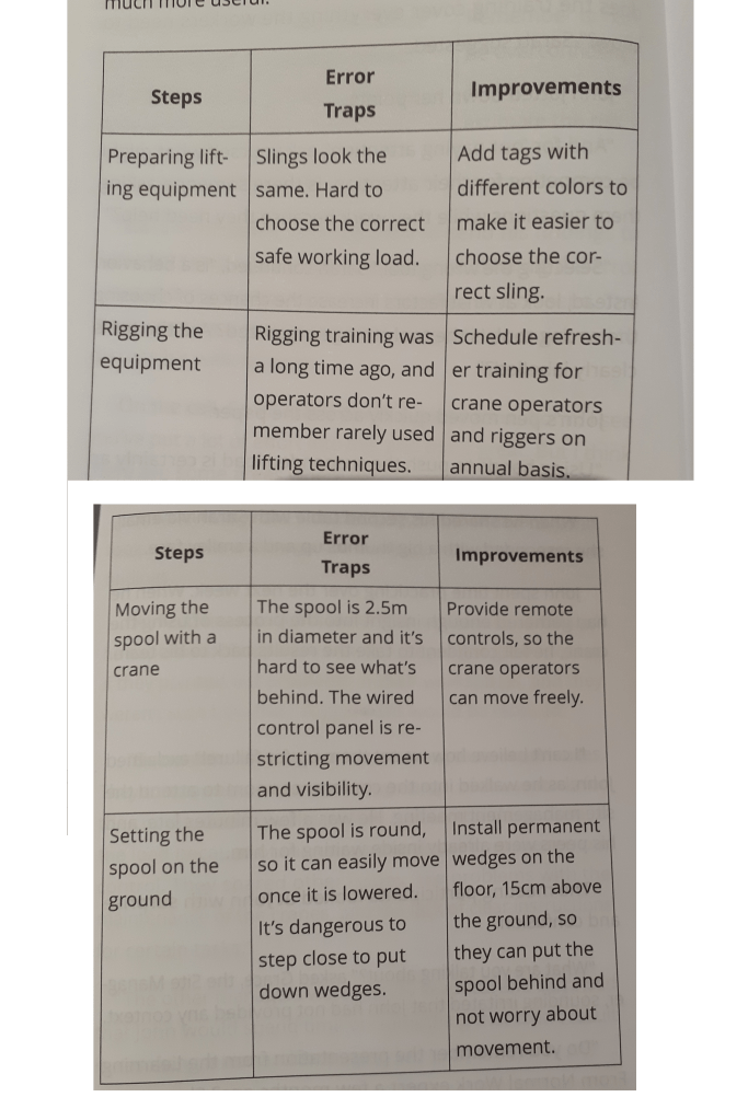 · Image 2 covers John’s second attempt – he reflects that while “dangerous behaviours, like pushing the spool during lifting, would usually result in disciplinary action”, but “after his walk-through talk-throughs, he could see that these actions were simply adaptations to get around the error traps of the job”