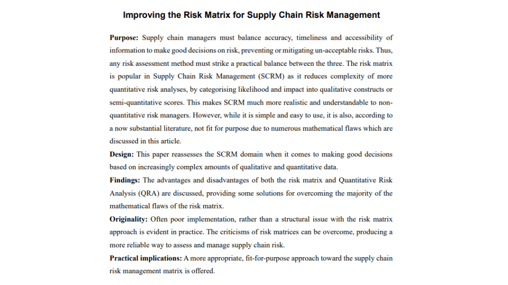 Ref: Hill, A., & Cole, R. (2025). Improving the risk matrix for supply chain risk management. Continuity & Resilience Review, 7(2), 166-181.