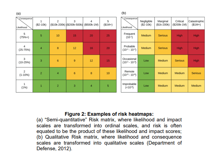 · In “semi-quantitative” RMs, the application of ordinal scaling (e.g., 1–5 scores) is “fairly arbitrary, with each number representing inconsistent ranges” and these ordinal numbers give “a false sense of accuracy and robustness that disappears under scrutiny”