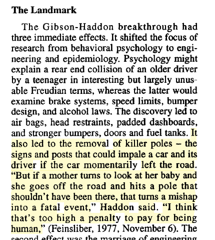 A beautiful reflection from one of the GOATs in public safety – William Haddon Jr, about how dying for a moment of distraction, due to largely design matters, is