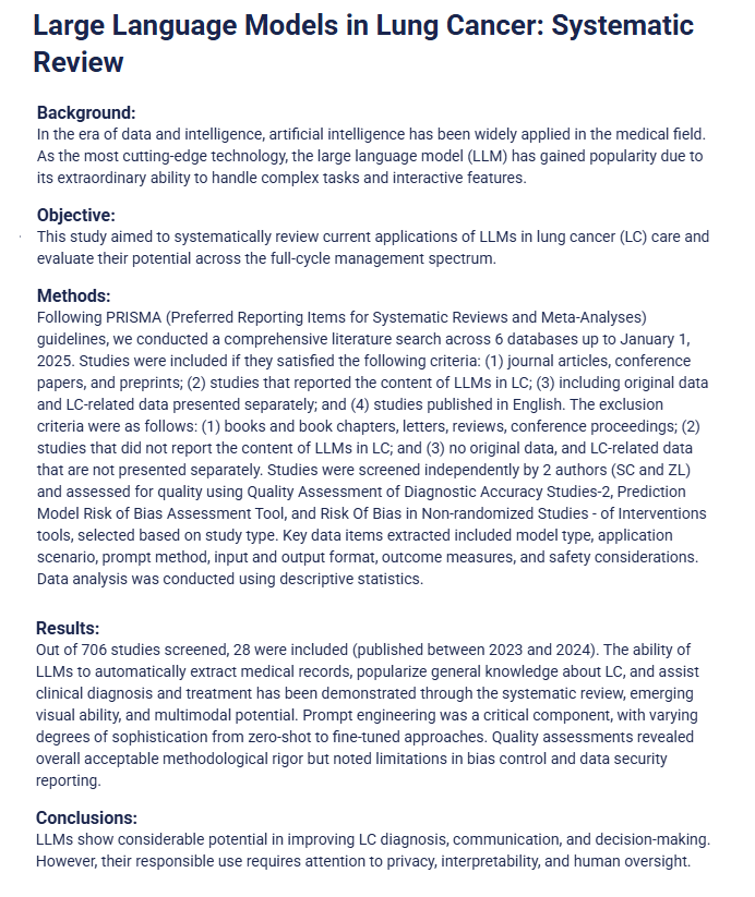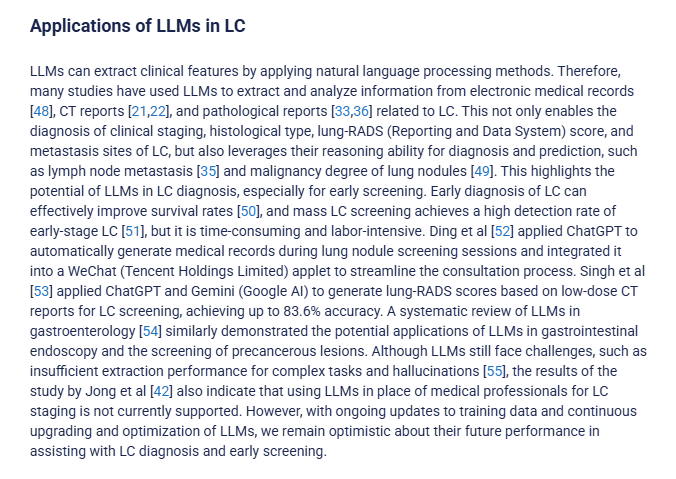 Ref: Zhong R, Chen S, Li Z, Gao T, Su Y, Zhang W, Liu D, Gao L, Hu K Large Language Models in Lung Cancer: Systematic Review J Med Internet Res 2025;27:e74177