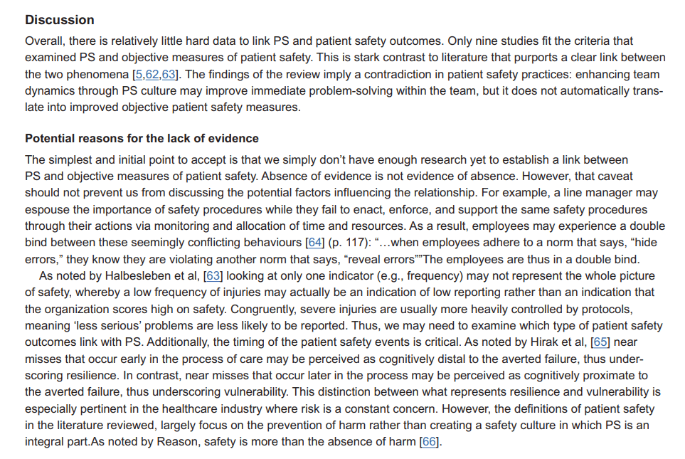 · “No clear conclusions can be extracted regarding the relationship between psychological safety and patient safety”