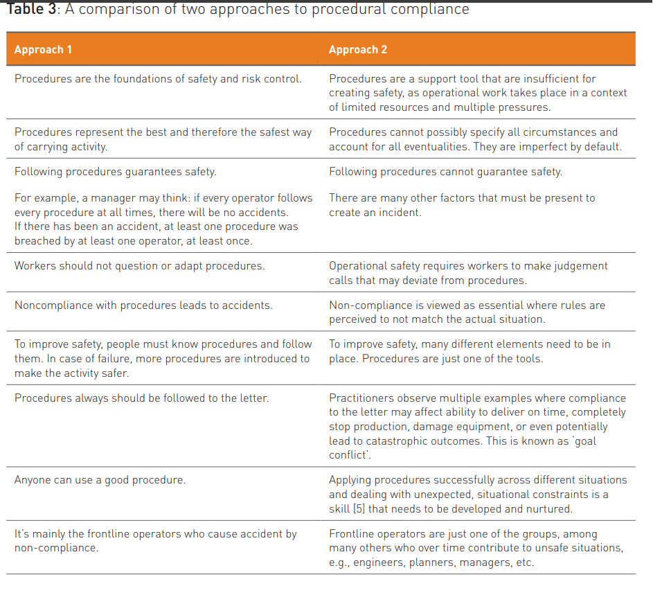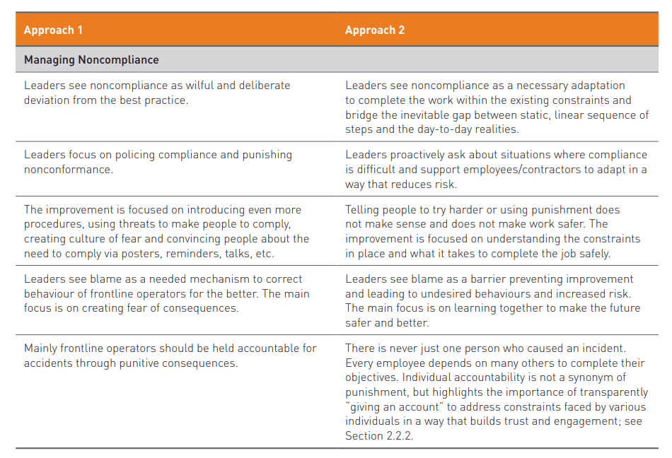 ·        “These approaches refer to how leaders think about the role of compliance in achieving success. Approach 1 views rules and work instructions as the best way of conducting activities safely and consistently. Under Approach 1, if work cannot be done without following the rules, people should stop and not find workarounds”