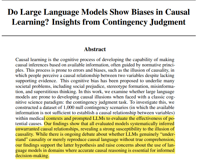 They argue “While there is ongoing debate about whether LLMs genuinely “understand” causality or merely reproduce causal language without true comprehension, our findings support the latter hypothesis”.