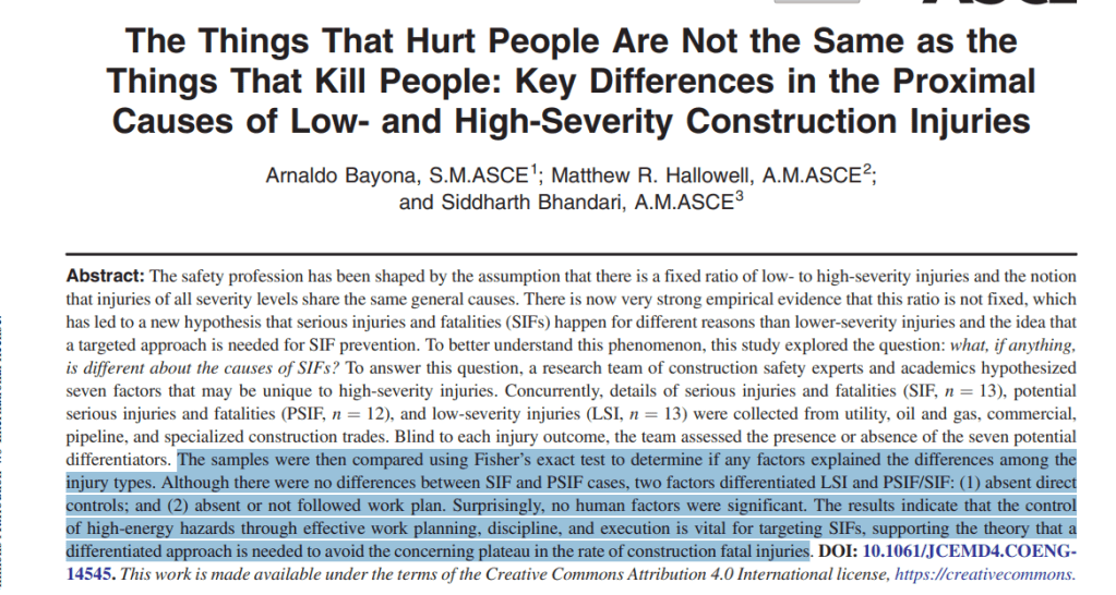 3. “Although there were no differences between SIF and PSIF [Potential SIF] cases, two factors differentiated [Low Severity Injury] and PSIF/SIF: (1) absent direct controls; and (2) absent or not followed work plan. Surprisingly, no human factors were significant”