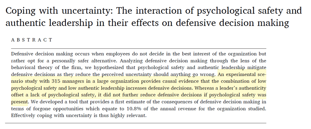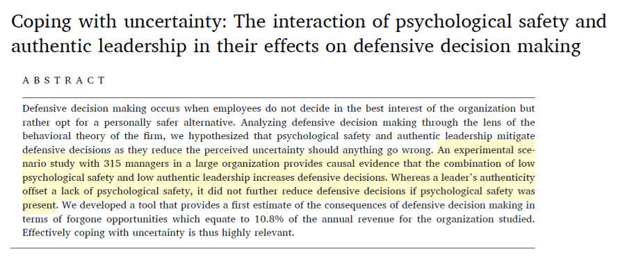 ·        They provide “causal evidence that the combination of low psychological safety and low authentic leadership increases defensive decisions”