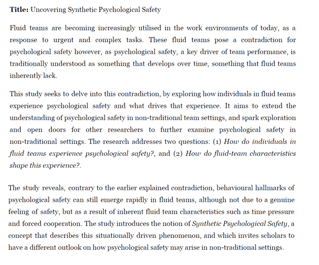 Ref: Lindqvist, M., Frammin Tillema, H., & Norr, A. (2025). Uncovering Synthetic Psychological Safety: An exploratory study on psychological safety in fluid teams.