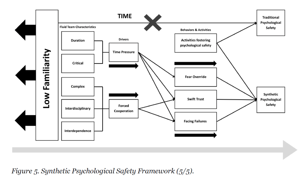 · “The findings show that time pressure and forced cooperation can create a synthetic form of psychological safety; situational and pragmatic which unlocks similar collaborative behaviours that more traditional teams build through interpersonal relationships”