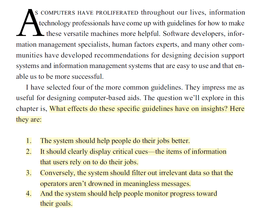 · “Guideline 2: The system should clearly display critical cues” but when “When we identify critical cues in advance, we’ll likely miss those that unexpectedly become relevant after we have an insight”