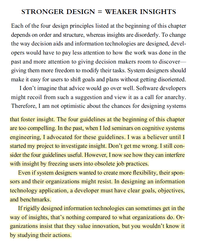 · “Each of the four design principles listed at the beginning of this chapter depends on order and structure, whereas insights are disorderly”