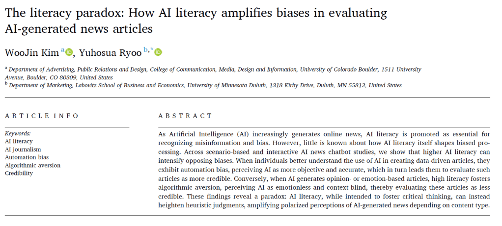 · “AI literacy does not inherently enhance credibility; rather, it may paradoxically undermine it. This finding underscores a complex dynamic: while AI literacy aims to clarify AI operations and foster understanding, it may instead induce skepticism and diminish trust in AI-generated news content”