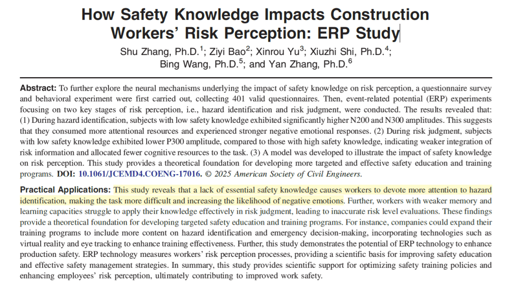 ·        “This ultimately contributes to greater accuracy and reliability in hazard identification. These findings highlight the crucial role of safety knowledge in attentional control and emotional regulation during the initial phase of hazard identification”