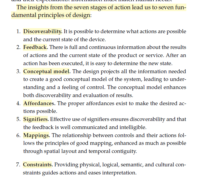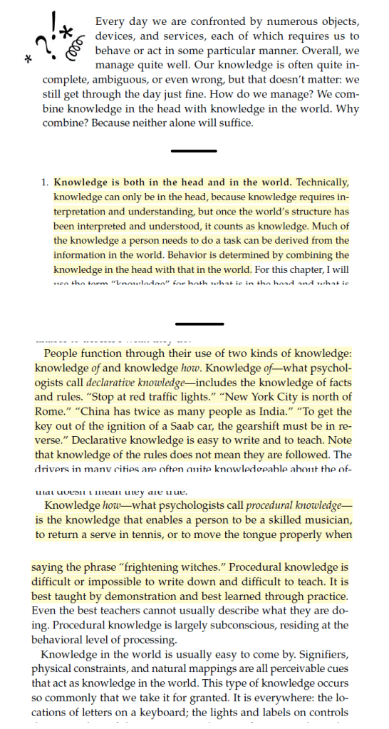 ·    “Knowledge in the world is usually easy to come by. Signifiers, physical constraints, and natural mappings are all perceivable cues that act as knowledge in the world”