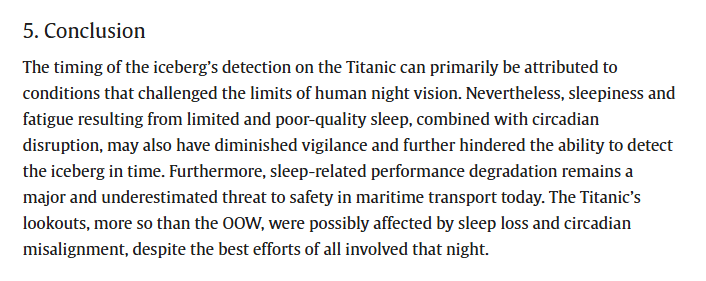 ·        “The Titanic’s lookouts, more so than the OOW [Officer of the Watch], were likely affected by sleep loss and circadian misalignment”