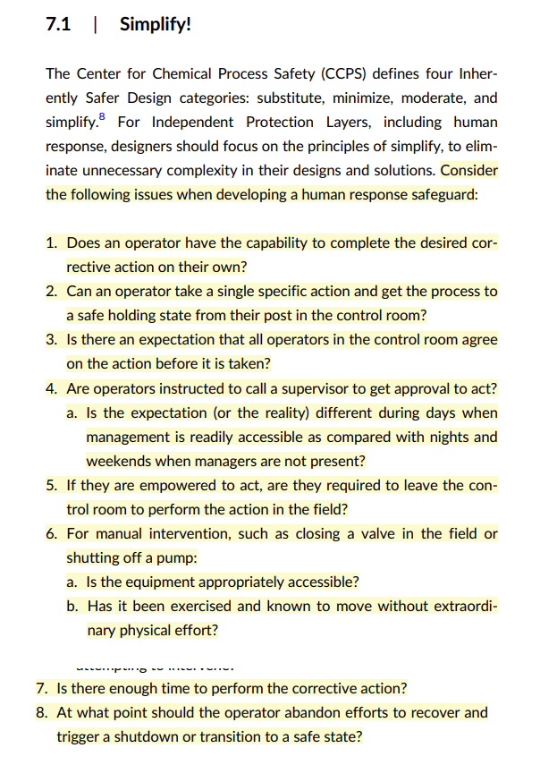 ·        They discuss the often robust layers of protection analysis for barriers, and argue that we should also apply this thinking to human safeguards, e.g. people “must be able to receive the information indicating an abnormal condition, decide on the best corrective action, and perform that action safely before the identified consequence occurs”