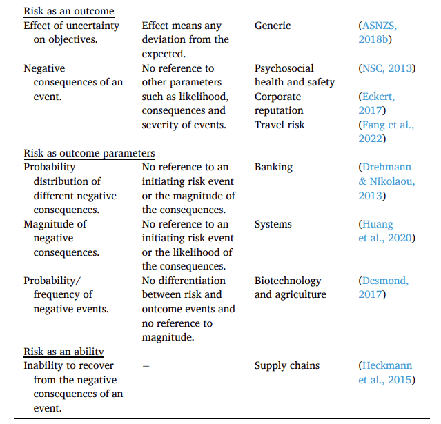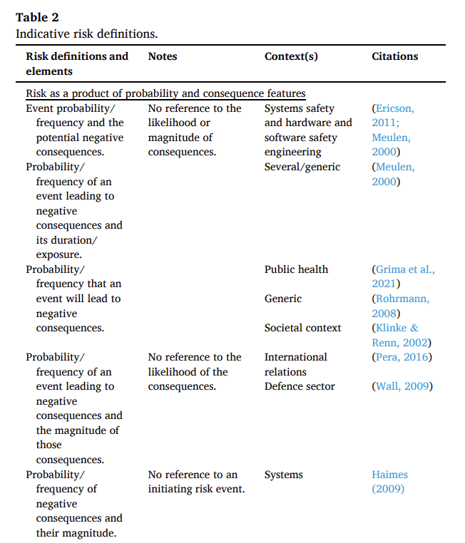 In other works they also incorporate resilience, risk appetite, and more, into their definitions. They have argued that risk is often, but not always, a combination of objective, subjective, and intersubjective elements.