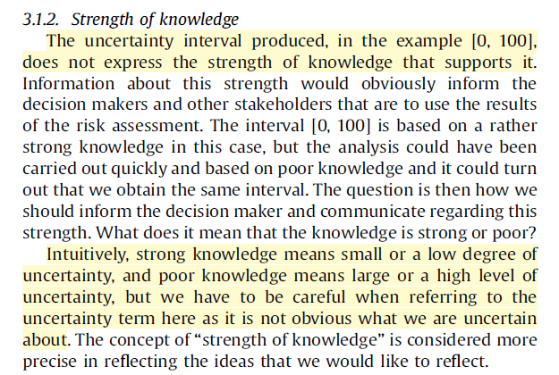 And, without excluding other definitions, here they argue that risk can include: “identified events and consequences, assigned probabilities, uncertainty intervals, strength of knowledge judgements, as well as considerations about surprises (black swans)”.